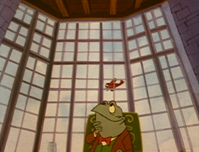 There is, however, one alternate ending which is a bit more in keeping with Grahame's tone, allowing for a subtle modification of Toad's need for new obsessions and demonstrating his exceptional elasticity in discovering new outlets for his megalomania. The Rankin-Bass version ends with the quartet sitting around the fireplace in Toad Hall. Until now, the adaptation has followed Grahame's lead - Toad was scolded, remained silent at the banquet, and was praised by his friends for his humility. Only now Toad begins to agree with them - yes, he is humble, more humble than any other animal; he'll mortgage Toad Hall, give everything to charity, debase himself before the world because no other toad, indeed no animal has ever been so modest as he. The friends look at each other with exasperation; only Toad could so easily flip forced humility into another excuse to boast. And so his adventure continues; you can take the Toad off the Open Road but you can't take the Open Road out of the Toad. You can, however, take the Toad out of Toad Hall, and perhaps keep him out; but that's next week's adventure...